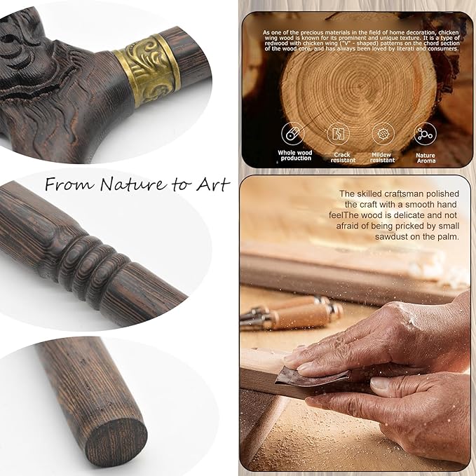 - 【Natural Rhythm of Wenge Wood】Expertly crafted from superior wenge wood, each walking stick man boasts a captivating blend of nature’s own beauty. The exquisite natural wood lines seamlessly flow across the dragon handle, creating an effortlessly organic connection, accentuating the walking cane ’s refinement and minimalist elegance.