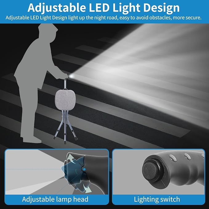 - 【Lighting & Massage Handle】This walking cane with seat combines massage and road lighting functions. The ergonomic handle design provides a comfortable grip, and the front of the handle is equipped with an adjustable angle flashlight that can ensure safety use at night.