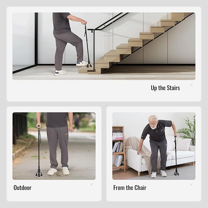 - 4 Prong Cane with Wrist Strap: Our 4 prong walking cane can stand on its own to avoid falling or dropping on the ground. The 4 pronged base can adapt to various terrains, stable and safe. Each prong is covered with a anti slip rubber. In addition, the wrist strap reduces fatigue and provides a comfortable amd secure grip