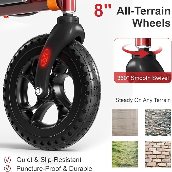 - 【All-Terrain 8" Wheels for Superior Stability】 Glide smoothly over diverse surfaces like gravel and grass with 8" puncture-proof rubber wheels. The 360° swivel front wheels ensure effortless maneuvering indoors and outdoors, providing reliable support and a stable adult walk for seniors on any terrain.