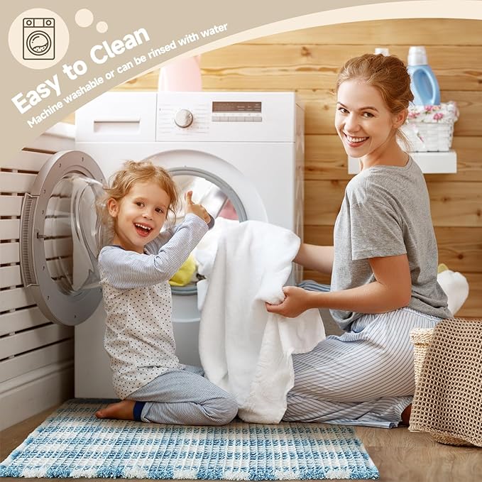 Waffle Bath Mat, Boho Bathroom Rugs Non Slip Washable Absorbent Checkered Bathroom Mat Quick Dry Cute Bath Mat, 36"x24" Blue and White