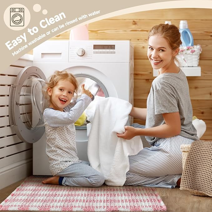 Waffle Bath Mat, Boho Bathroom Rugs Non Slip Washable Absorbent Checkered Bathroom Mat Quick Dry Cute Bath Mat, 48"x24" Pink and White