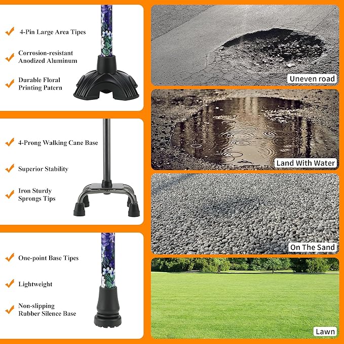 - THREE KINDS OF WALKING CANE TIP FOR REPLACING - Non-slipping rubber silent-base ensure all time whisper quiet movement, max traction and safety at any surfaces, indoors or outdoors. One of the tip is one point walking cane base can smoothly and securely locks in place to provide extra stability when you going up/down stairs or walking on any surface, when you change the other large quad base, you can get a self standing walking cane, it will not fall to the ground when released your hands
