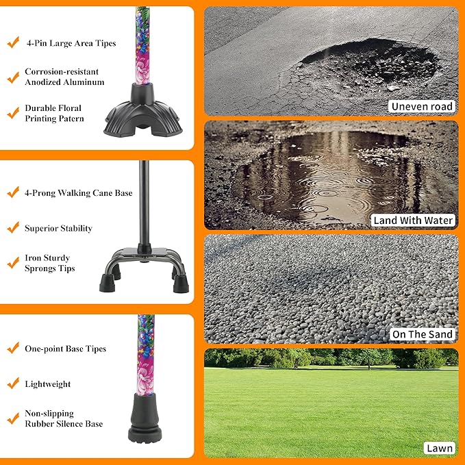 - THREE KINDS OF WALKING CANE TIP FOR REPLACING - Non-slipping rubber silent-base ensure all time whisper quiet movement, max traction and safety at any surfaces, indoors or outdoors. One of the tip is one point walking cane base can smoothly and securely locks in place to provide extra stability when you going up/down stairs or walking on any surface, when you change the other large quad base, you can get a self standing walking cane, it will not fall to the ground when released your hands