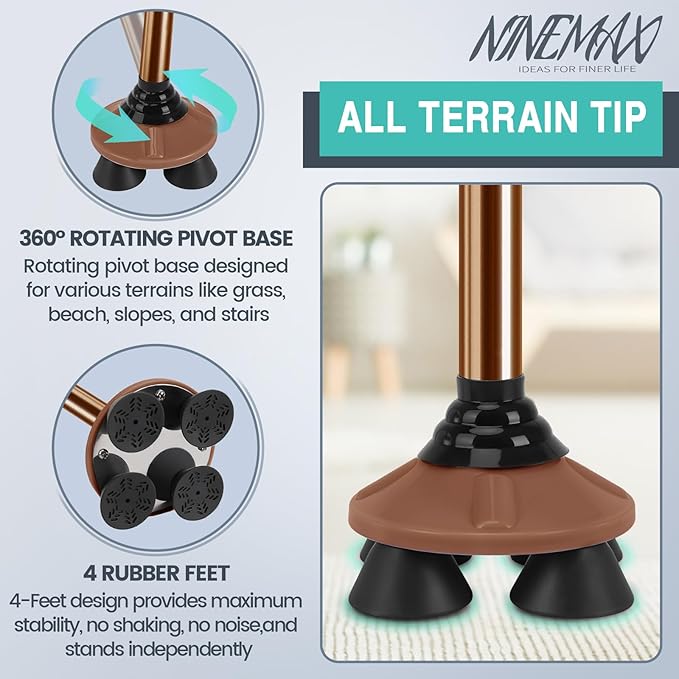 - 【All Terrains Cane with Free Standing】This adjustable cane is designed to stand independently and is equipped with a 360-degree rotating pivot base for all terrains. The four shock-absorbing rubber foot pads on the base provide extra strong anti-slip capability, ensuring superior stability even on uneven surfaces and help reducing impact on the muscles