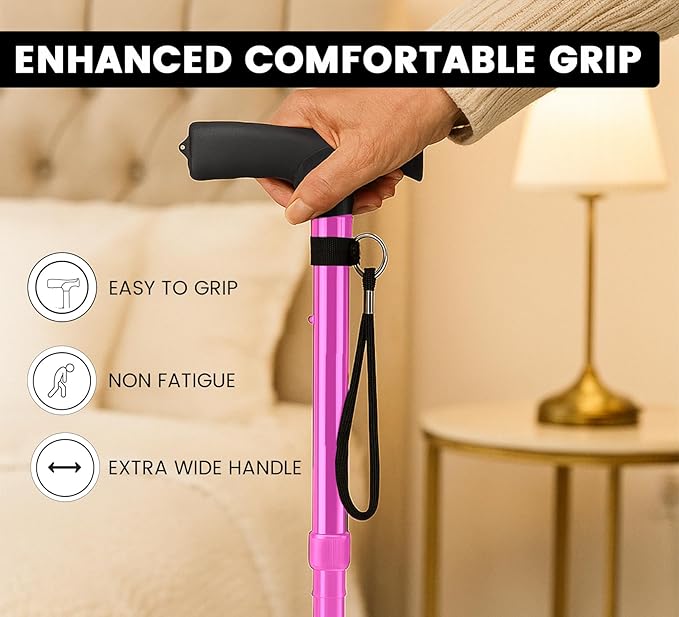 - [ Enhanced Palm Comfort for Longer Walks ] Our ergonomic handle is designed wider and longer than standard T-grip canes to provide a larger palm-contact area for superior comfort and reduced pressure. The soft TPR material minimizes hand fatigue during extended use, making it ideal for seniors, adults, and anyone needing a reliable walking cane for men or women. A secure nylon wrist strap helps prevent accidental drops for added convenience.
