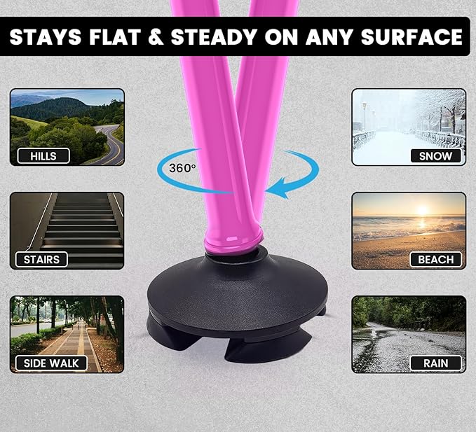 - [ Reliable Stability with Non-Slip Base ] The rotating quad base keeps all four pads in contact with the ground, helping you stay steady on uneven paths and indoor floors. The non-slip rubber pads provide secure traction and reduce the chance of slipping, giving seniors and adults more confidence with every step