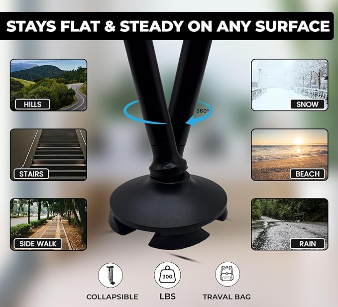- [ Reliable Stability with Non-Slip Base ] The rotating quad base keeps all four pads in contact with the ground, helping you stay steady on uneven paths and indoor floors. The non-slip rubber pads provide secure traction and reduce the chance of slipping, giving seniors and adults more confidence with every step