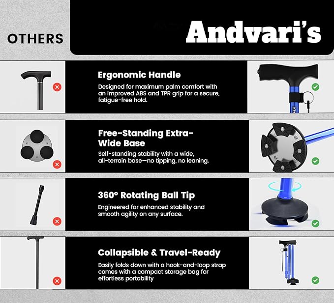 - [ Enhanced Palm Comfort for Longer Walks ] Our ergonomic handle is designed wider and longer than standard T-grip canes to provide a larger palm-contact area for superior comfort and reduced pressure. The soft TPR material minimizes hand fatigue during extended use, making it ideal for seniors, adults, and anyone needing a reliable walking cane for men or women. A secure nylon wrist strap helps prevent accidental drops for added convenience.