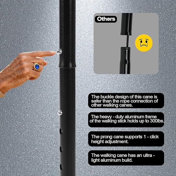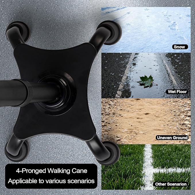 - Walking Canes with 4-Pronged Quad Base Stable Support, Safety at All Times;Unlike traditional single-legged canes, the cane with 4 legs design fundamentally enhances support stability, acting like a "solid base" for walking:
