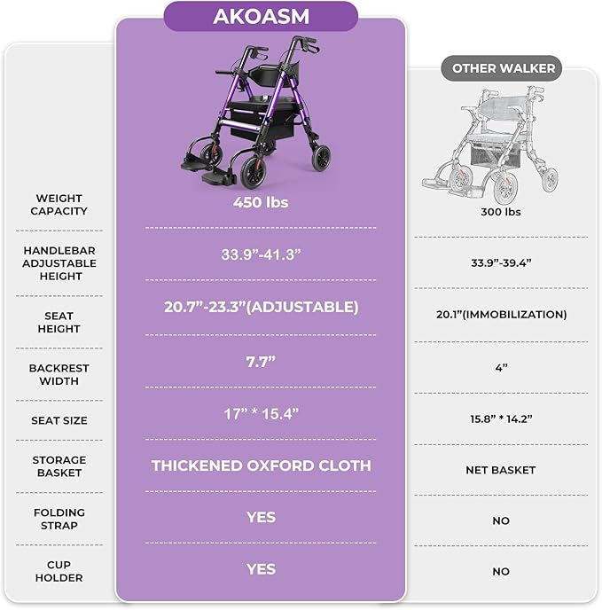 - 【ROLLATOR WALKERS FOR SENIORS WITH SEAT】AKOASM walker wheelchair combo supports a maximum load of 450 lb, making it ideal for heavier seniors and individuals with special needs. Its reinforced aluminum frame and high-strength rollers ensure safe and stable support. The comfortable seat and armrests provide reliable assistance, helping users move easily both indoors and outdoors