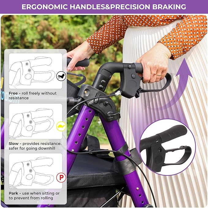 - 【3 MODE BRAKES & ALL ROUND SAFETY】AKOASM advanced rolling walker for seniors is designed with 3-in-1 Braking System (Free/Slow/Stop) , even for users with limited strength or recovering from neurological conditions. rollator walkers for seniors with seat includes an upright auxiliary cane for extra support when standing and safety straps on the waist and footrest to prevent balance loss due to tremors. Every design element prioritizes safety and stability