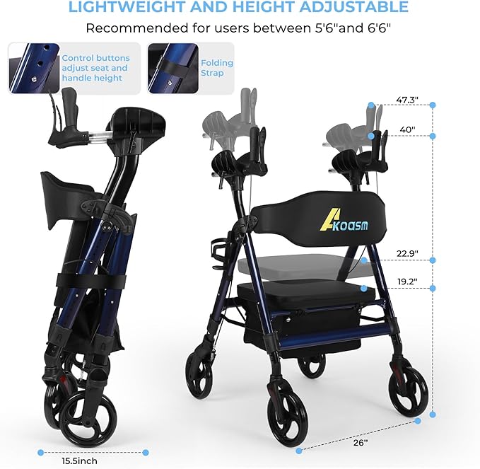 - 【UPRIGHT WALKERS FOR SENIORS】AKOASM heavy duty rollator combines safety and comfort. The reinforced aluminum frame support up to 450 lbs, making it ideal for heavier individuals or post-recovery use. AKOASM upright walkers promote a natural posture, reducing neck/shoulder strain while walking or standing
