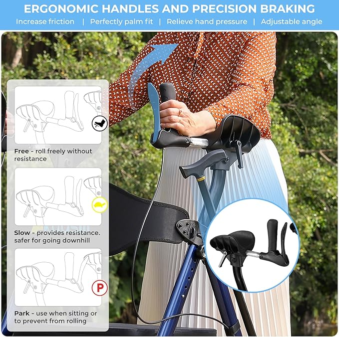 - 【3-MODE BRAKES & ALL-ROUND SAFETY】3-in-1 Braking System (Free/Slow/Stop) effectively improves the safety of use on slopes and crowded areas. Even for users with limited strength, AKOASM rollator walker with seat can be easily operated. Safety fastening straps on the waist and foot rest further enhance stability. This reflects AKOASM's commitment to providing reliable walkers for adults
