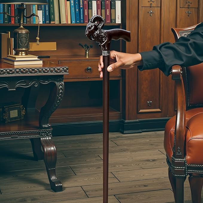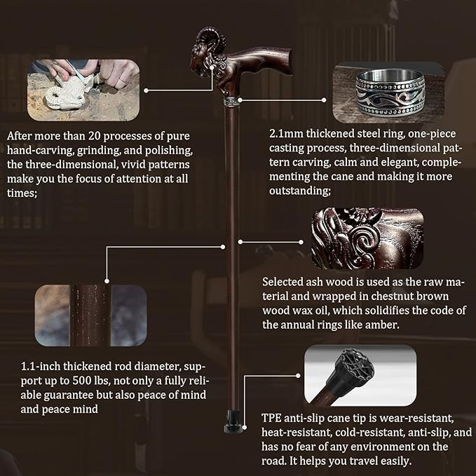 - PASTORAL IN PALM | ERGONOMICS AS NATURE INTENDED: When the artisan’s blade graces Appalachian ashwood, dormant rings awaken into a 360° three-dimensional ram’s head totem. When you stand and look into the distance with this hand carved with animal head wooden cane, the spine of the sheep curve nestles naturally in palms, while the ninth horn groove aligns with thumb contours. An ergonomic indentation cradles knuckles, transforming wilderness vitality into urban elegance with every step