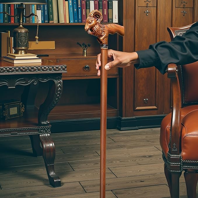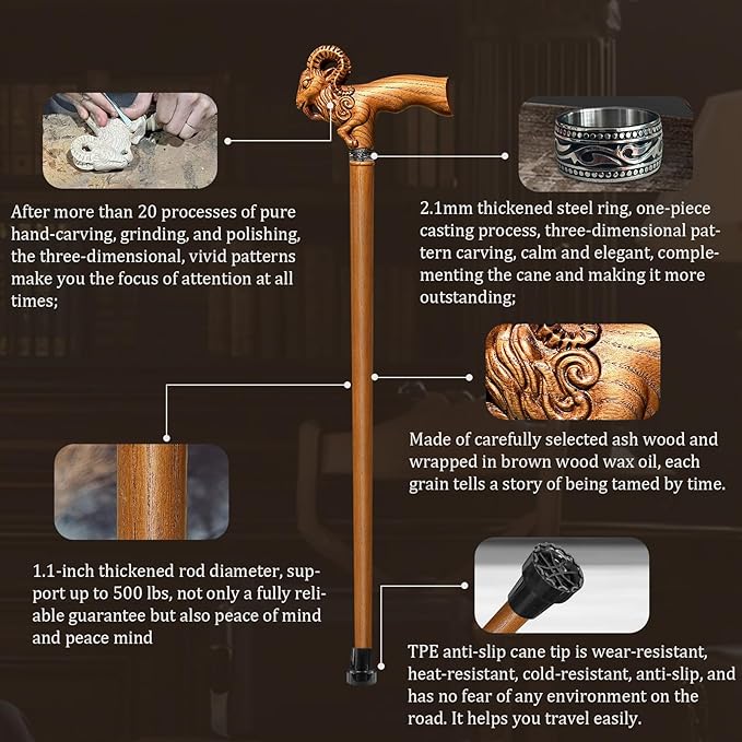 - PASTORAL IN PALM | ERGONOMICS AS NATURE INTENDED: When the artisan’s blade graces Appalachian ashwood, dormant rings awaken into a 360° three-dimensional ram’s head totem. When you stand and look into the distance with this hand carved with animal head wooden cane, the spine of the sheep curve nestles naturally in palms, while the ninth horn groove aligns with thumb contours. An ergonomic indentation cradles knuckles, transforming wilderness vitality into urban elegance with every step