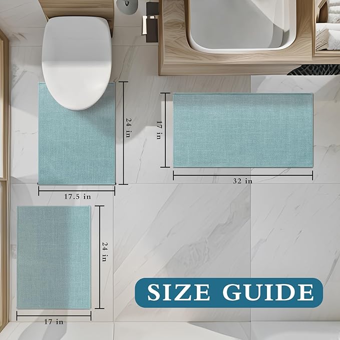 - 【Bathroom Rug Sets 3 Piece】Includes small bath mat 24" x 17", U-Shaped counter rug 24" x 17.5", large bathroom rugs 32" x 17". Quick Dry bath mat can be used by the tub, in front of the sink, shower, kitchen