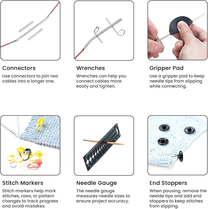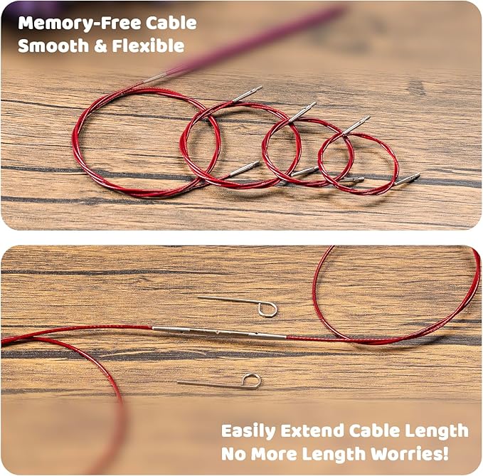 - [Comprehensive Knitting Accessories]: Our set includes 4 cables to make needle lengths of 20'', 28'', 35'', 44'' , stitch markers, end caps and more, providing everything needed for knitting. We provide a purchase link for replacement cables! You can find this link in the product description area below!