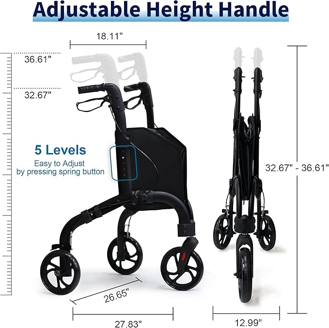 - ✅ Honest statement: Please pay attention to the height adjustment range of the handle. It is not suitable for people who are too tall; Not suitable for those who need to sit for long periods of time due to severe illness; The stability of three-wheel design is less than that of four wheels, When using with one hand, please be careful to prevent tilting; The foldable locking buckle is a bit tight in the beginning.