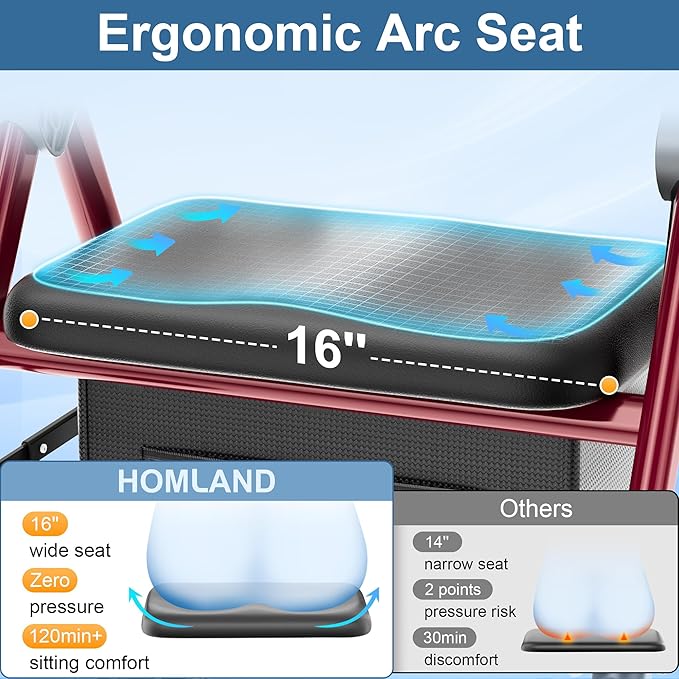 - Ergonomic Comfort Seat: Features a wide memory foam seat with pressure-relieving curves for enhanced comfort, perfect for extended sitting during walks with rollator walkers for seniors.