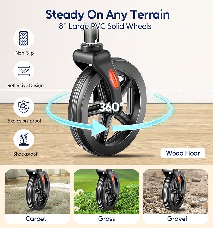 - 350 lbs Heavy-duty Stability: Bluelog walkers for seniors features reinforced durable frame and stable tower structure, support up to 350lbs. Thickened tube, double high-strength H-crossbar and 8'' all-terrain wheels ensure stability on gravel, grass or uneven surfaces, giving seniors confidence on any surface