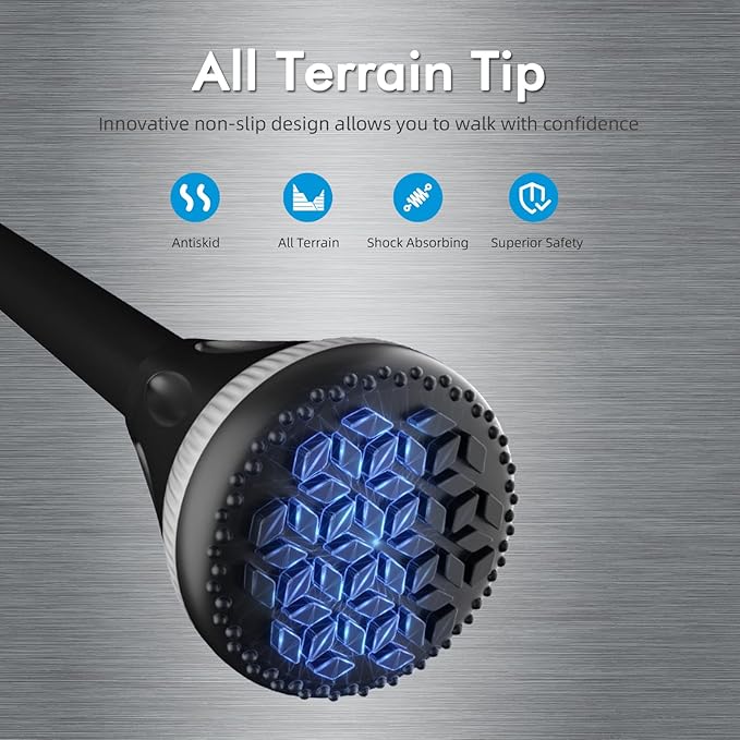 - Antiskid & Shock Absorbing:Years of accumulated cutting edge technology have been perfectly applied. All terrain damping & slip-resistant base provides superior stability and ground contact on uneven surfaces. Multilayer rubber structure absorbs shocks and dampens the impact on the joints and muscles from shocks. Entire base system maximizes the safety in daily mobility