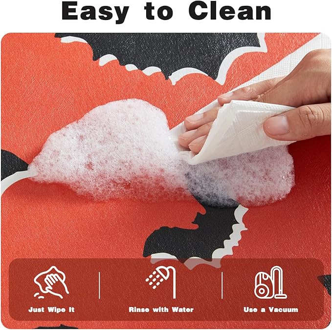 - Easy to Care: Thanks to the hairless surface layer, our halloween bathroom mats are easy to clean. Just simply wipe it with a wet cloth, rinse it or use vacuum cleaner. And dry it in open air after washing. No need machine wash and please do not use of dryer or bleach cleaning