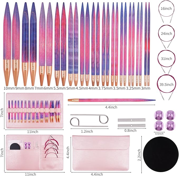 - Interchangeable circular knitting needles, 13 sizes, 16inch(40cm)-20inch(60cm)-32inch(80cm)-40inch(100cm)-4 different lengths, 52 combinations, suitable for various knitting projects.