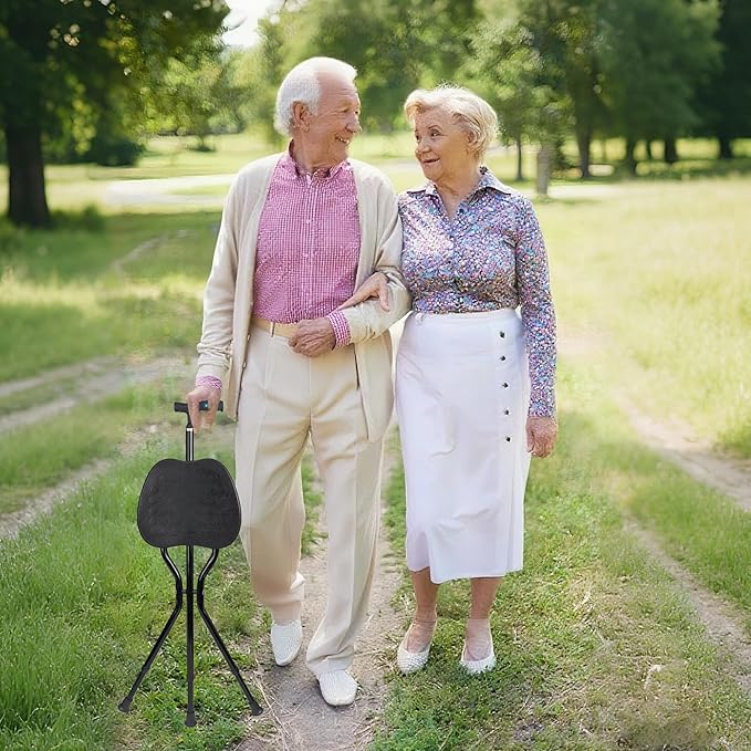 - Compact and easy to fold: Weighing only 2.4 pounds, this walking stick with seat is designed for easy use and features an easy folding mechanism that allows it to be folded into a compact form. The unique three-legged design of the seat improves stability and can be neatly folded, making it easy to carry, perfect for use in the park, hiking, shopping, queuing, outdoor rest, travel.