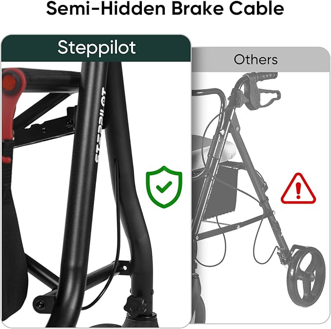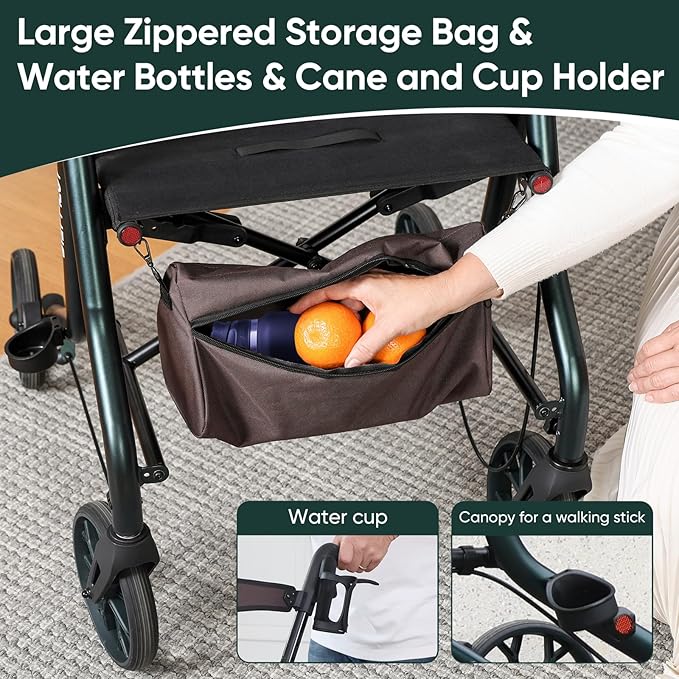 - Strong & Stable Frame: Built from heavy-duty carbon steel with a reinforced triangular structure, this walker confidently supports up to 300 lbs. It combines strength with portability and includes a spacious under-seat storage bag for personal items or groceries.