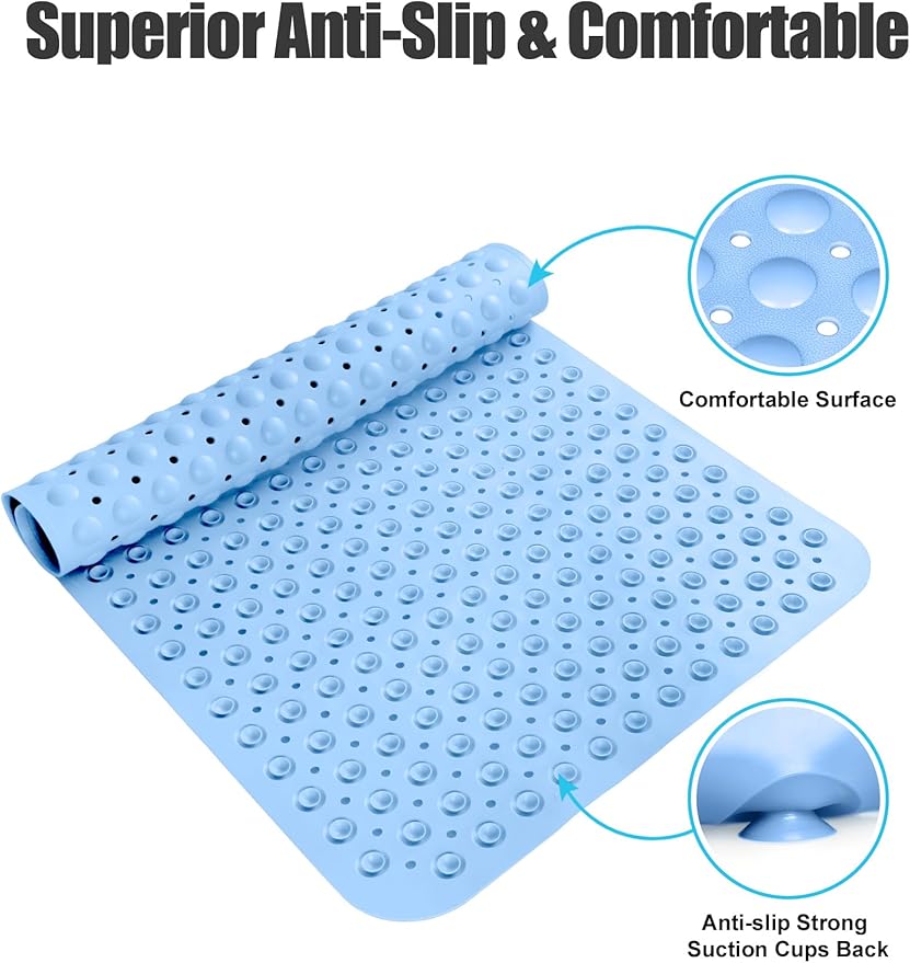 - Superior Anti-Slip Safety & Comfortable: 330+ suction cups provide superior grip on wet floors, making it a perfect non slip shower mat. TPE material is softer than rubber, non-slip footing even when wet. NOTE: Secure our full coverage shower bath mat to just about any smooth, untextured shower stall or bath tub surface.