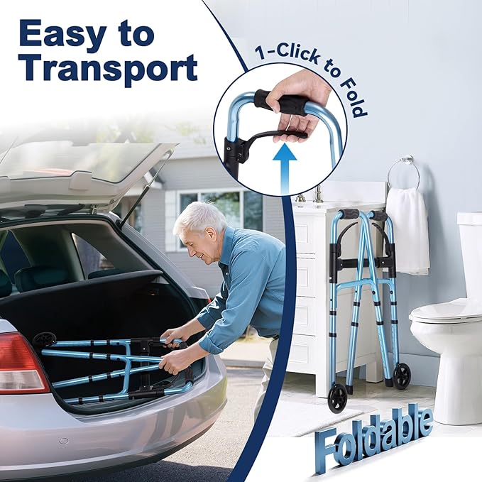 - Foldable Design: This narrow walker for spaces folds flat in seconds for compact storage in closets, cars, or tight spaces, perfect for daily use or travel. A truly compact walker for both home and on-the-go convenience