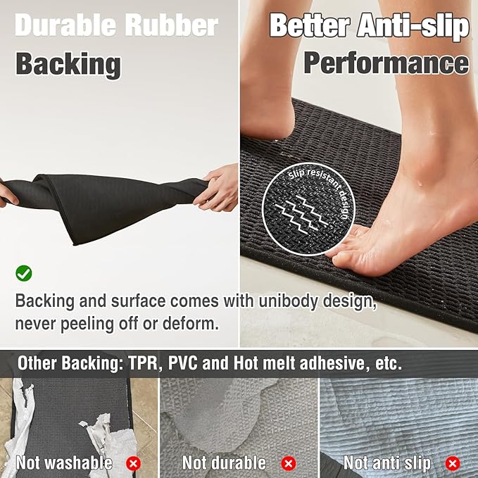 - Upgraded Non-Slip Backing: Walk with confidence! Featuring upgraded natural rubber backing, our bathroom mats provide strong grip on smooth floors. This non slip backing helps reduce slips for everyone's safety