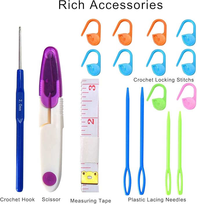 - What You Get:This knitting supplies included 55pcs short double pointed bamboo knitting needles,1 scissor,1 measuring tape,1 crochet hook,4 plastic lacing needles,10 crochet locking stitch in a small plastic bag.Complete knitting needles set meet your daily needs.