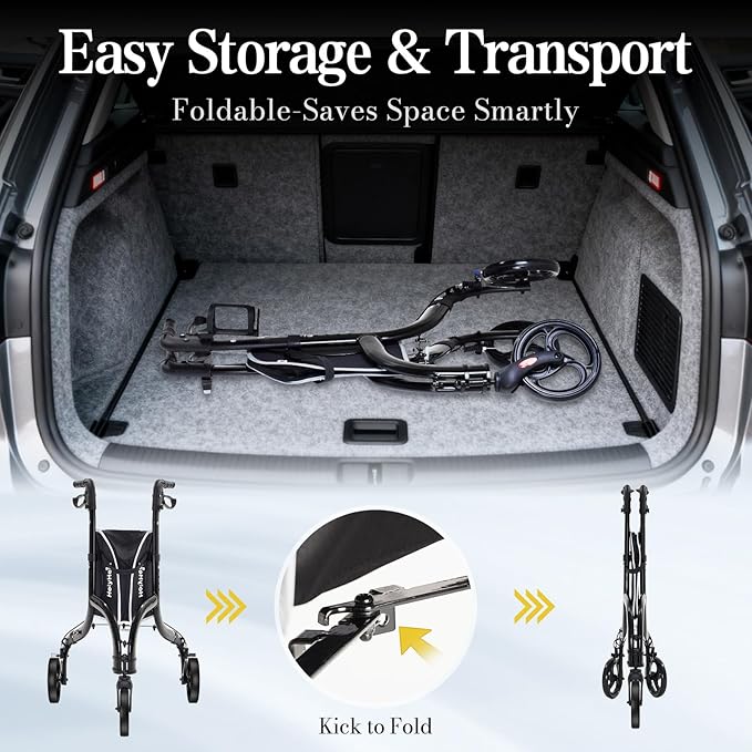 - Lightweight & Foldable: This lightweight walker for seniors features a simple folding mechanism that allows the wheeled rollator to fold flat in seconds for storage and transport, making it a convenient foldable walker while the slim folded walker structure enables reliable navigation in small spaces and crowded areas. Folding size 32.7"(H) × 11"(W)