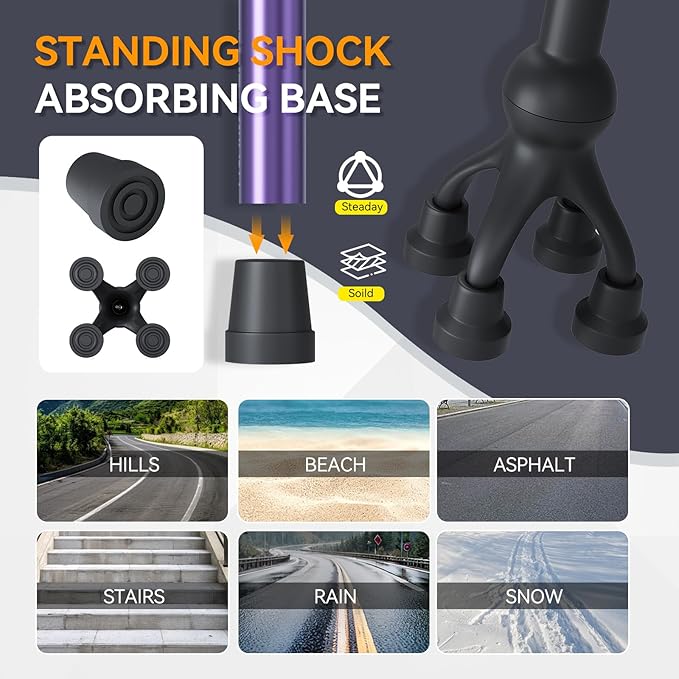 - 【All-Terrain Shock-Absorbing Base】 Equipped with a quad cane base and an extra small tip, this walking sticks for seniors offers enhanced stability on various surfaces. The shock-absorbing base allows the cane to stand on its own, reducing the need to bend over."