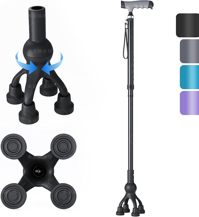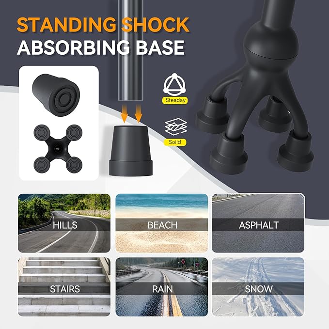 - "【All-Terrain Shock-Absorbing Base】 Equipped with a quad cane base and an extra small tip, this walking sticks for seniors offers enhanced stability on various surfaces. The shock-absorbing base allows the cane to stand on its own, reducing the need to bend over."