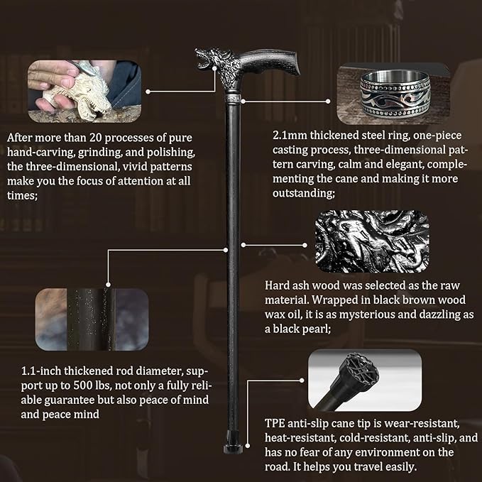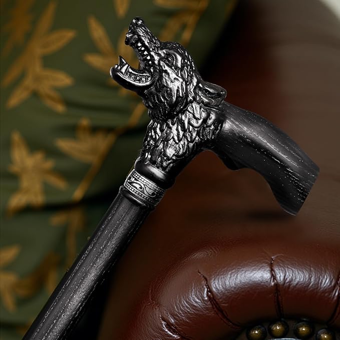 - A WORK OF ART IN YOUR PALM: Each time you hold this hand-carved wooden cane, you feel its perfect harmony with your palm.The cane handle has undergone 267 adjustments based on the contour of the palm, solely to ensure all-day comfort without fatigue. The hand-carved wolf head is not just decorative but symbolizes calm strength—accompanying your steady, confident strides. More than a ergonomic walking cane, it extends your personal style, making you the focus of attention with every graceful step