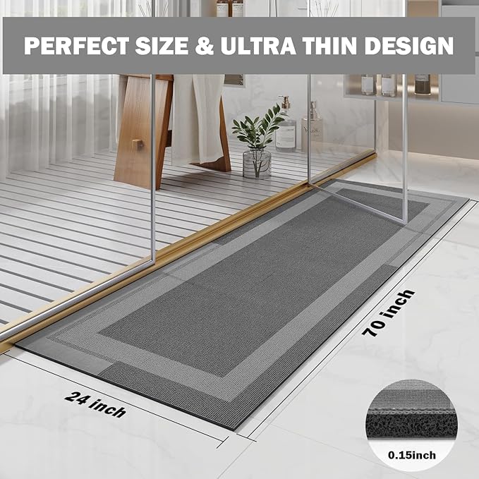 Extra Long Non Slip Bathroom Runner Bath Mat, Rubber Backing Ultra Thin Bath Rug Fit Under Door Quick Dry Super Absorbent Washable Shower Mat for Bathroom Floor Bathtub Sink, Dark Grey 24"x70"