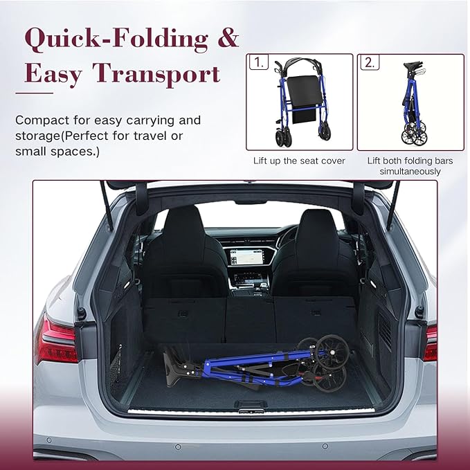 - 【Enhanced Structural Stability】The FVZZIN senior rollator weighs only 20 lbs and is designed for easy portability. Constructed with thickened aluminum and an additional reinforcement bar under the seat, this rollator walker offers greater strength and durability, supporting up to 310 lbs. It also features an innovative 3-second quick-fold mechanism, making it easy to store in a car trunk