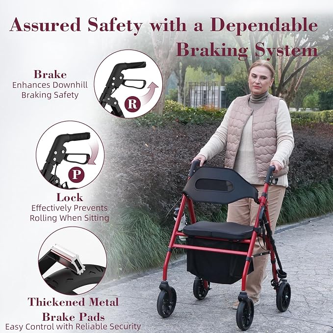 Walkers for Seniors, Foldable Rollator Walker with Seat, 8" Big Wheels, Lightweight Rollator Walker with Ergonomic Backrest, Adjustable Handles and Seat Height, 310 Lbs Weight Capacity, Red