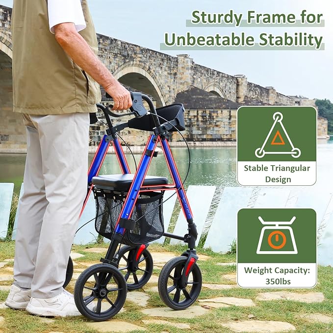- 【Sturdy & Lightweight】Our rollator walker weighs only 19.12lbs for easy carrying, with a reinforced triangular frame and aluminum alloy tubes for durability. Supporting up to 350lb (≈160kg), it provides stable, shake-free support. 3-second quick folding design for compact storage—fits easily in car trunks or tight spaces, ideal for seniors’ daily use and travel.