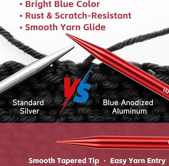 - Premium Aluminum Knitting Needles: Made of lightweight anodized aluminum, these knitting needles are ultra-smooth for snag-free stitching, rust-resistant, and comfortable for long sessions. Each tapered tip improves stitch insertion while reducing finger joint strain—perfect for lacework and dense projects