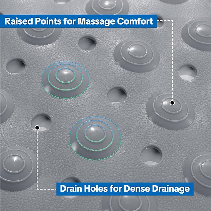 - 【Dual-Zone Design】The bath mats for bathroom features 2 functional zones for a all-in-one shower experience. Large massage-textured surface: It gently stimulates foot pressure points while you stand, soothe your feet, relieving fatigue from daily walking. Small Foot Scrub Zone: No bending over to clean foot and remove mild dead skin.