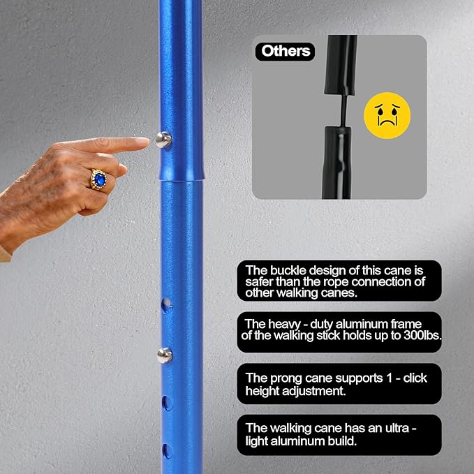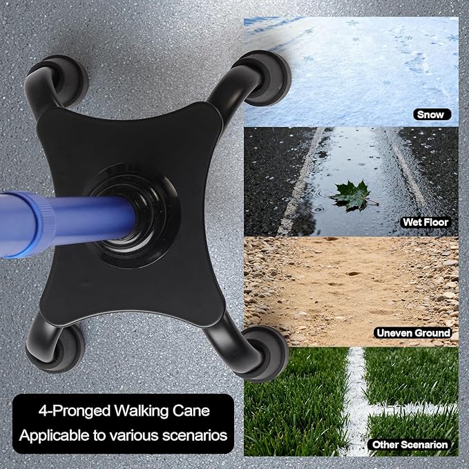 - Walking Canes with 4-Pronged Quad Base Stable Support, Safety at All Times;Unlike traditional single-legged canes, the cane with 4 legs design fundamentally enhances support stability, acting like a "solid base" for walking: