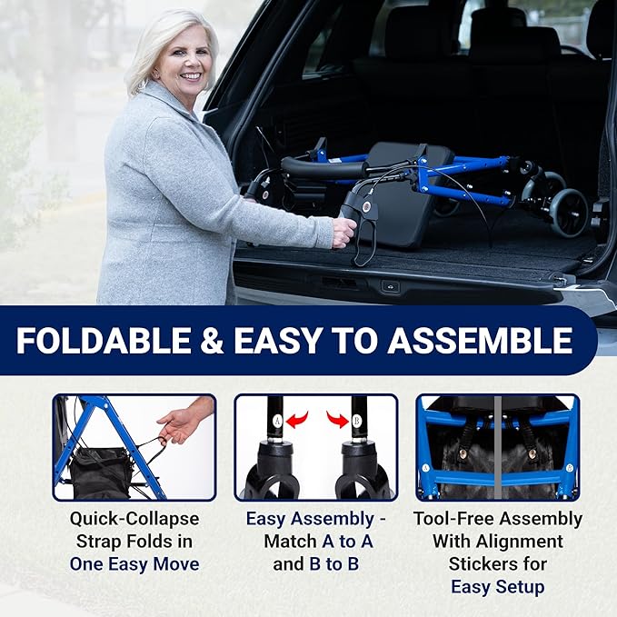 - FOLDABLE & EASY TO ASSEMBLE: Quick-collapse strap folds the rollator in one easy move for transport or storage. Features tool-free assembly with alignment stickers for easy, intuitive setup.