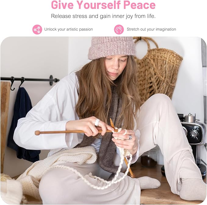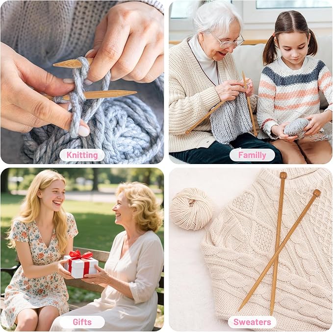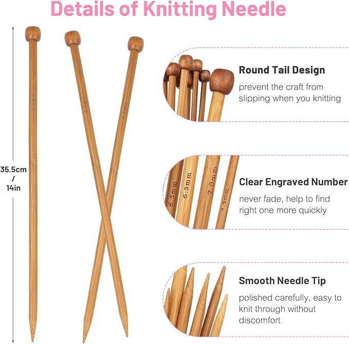 - [ Bamboo Needles Knitting Set] All knitting needles are bamboo made of bamboo wood material, lightweight, smooth to the touch and burr-free. The yarn does slide up and down the needles with ease. Wooden knitting needles would be warmer and easier to hold than steel. Bamboo knitting needle that can be easily used by arthritic hands and beginners.