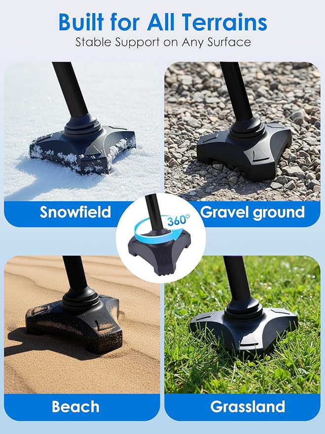 - šš¹š¹-š§š²šæšæš®š¶š» š¦šš®šÆš¶š¹š¶šš: A widened triangular base keeps perfect balance on any surface ā from carpets and wooden floors to grass, tiles, and rough outdoor paths. This special base gives the walking canes for seniors key advantages like being anti-slip, free standing, and shock-absorbing, ensuring stable, reliable support wherever you go.