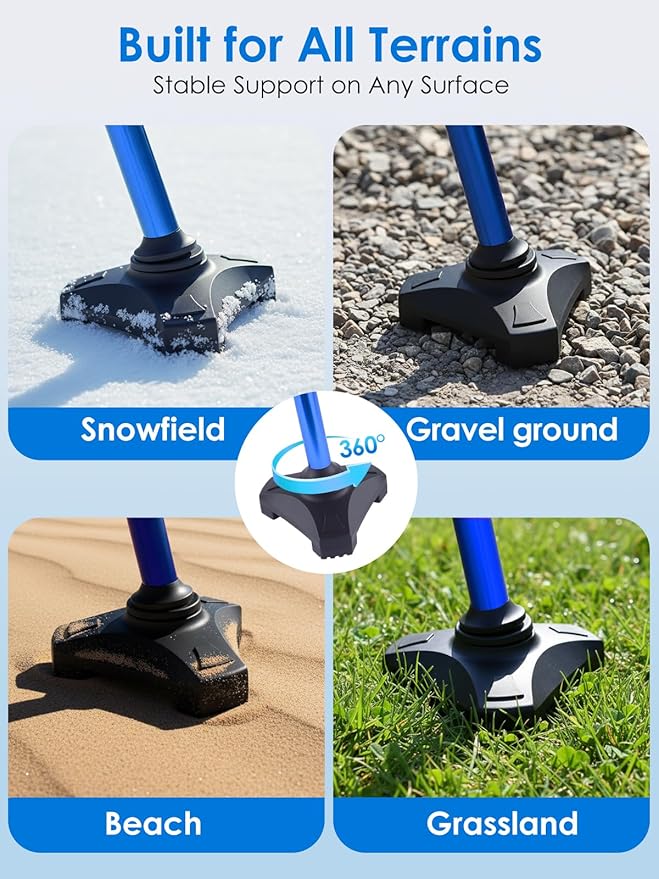 - šš¹š¹-š§š²šæšæš®š¶š» š¦šš®šÆš¶š¹š¶šš: A widened triangular base keeps perfect balance on any surface ā from carpets and wooden floors to grass, tiles, and rough outdoor paths. This special base gives the walking canes for seniors key advantages like being anti-slip, free standing, and shock-absorbing, ensuring stable, reliable support wherever you go.