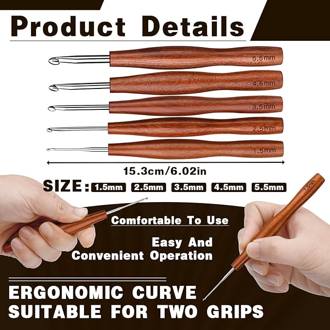 - Ergonomically Designed Wooden Handle: Our Ergonomic Crochet Hook Crafted from high-quality wood, meticulously polished to fit the curves of your palm, minimizing fatigue after prolonged use, enhancing knitting comfort and stability
